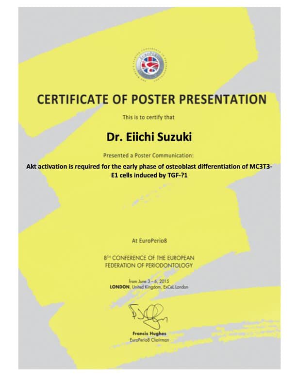 こんにちは、歯科鈴木医院 副院長の鈴木瑛一です。私は2011年に東京歯科大学を卒業し、その後歯周病治療を主とした診療の研鑽のため、大学の歯周病学講座に入局しました。また、大学院へ進学し、臨床と研究と日々を送りました。 研究では主に歯を支える骨を作るためのメカニズム解明の解明に従事し、iPS細胞などを用いた骨分化メカニズムの解明をメインとし、多くの研究を行って参りました。 大学病院中は休日返上で多くの臨床・研究を行い、将来における地域医療への還元のために研鑽して参りました。