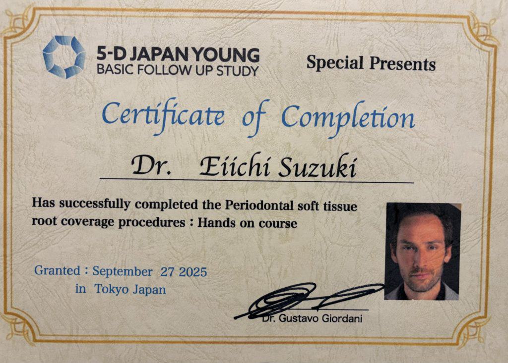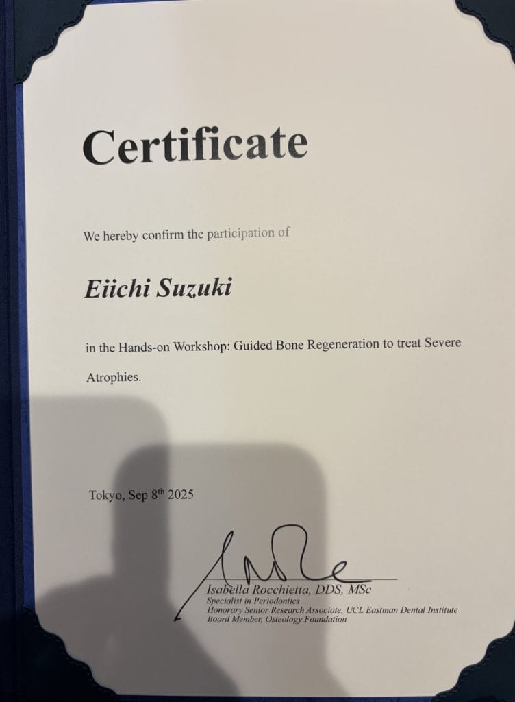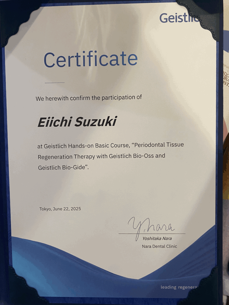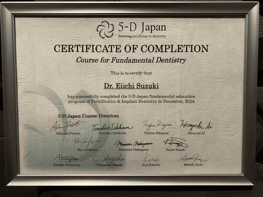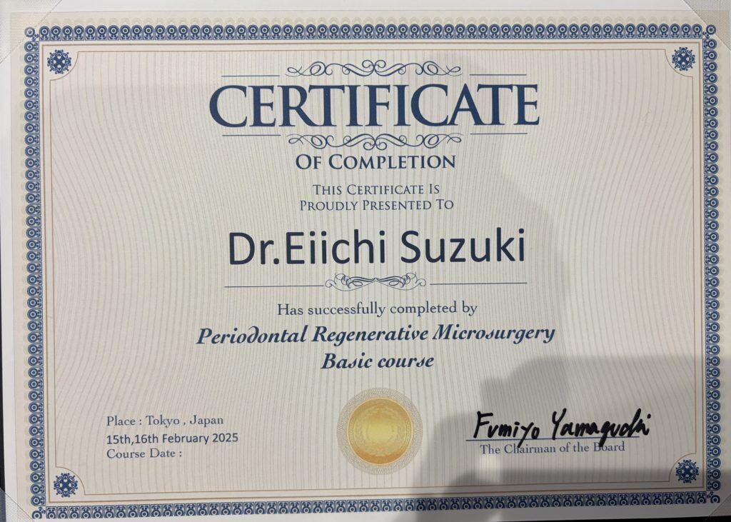 現在では、大学で若手ドクターの指導や対外セミナー等での講演を行っておりますが、自分自身日々新しい技術を学んでおり、地域の皆様にできる限り最新の歯周組織再生療法の技術を提供できるようにしております。また、歯周病の進行にはかみ合わせや他の様々な要因が関与しています。当院ではインプラント治療を始め、咬合に関しても研鑽を積み、より良い治療が提供できますので、お気軽にご相談いただければ幸いです。